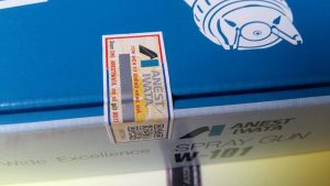 - Tem chống hàng giả: Tem này dán bên ngoài vỏ hộp, được Anest Iwata sản xuất để bảo vệ người tiêu dùng tại Việt Nam. Chỉ cần cào mã số, gửi về tổng đài để kiểm tra. Hiện nay dù là súng nguyên chiếc hay linh kiện thì đều có tem dán bên ngoài nên mọi người có thể hoàn toàn yên tâm.